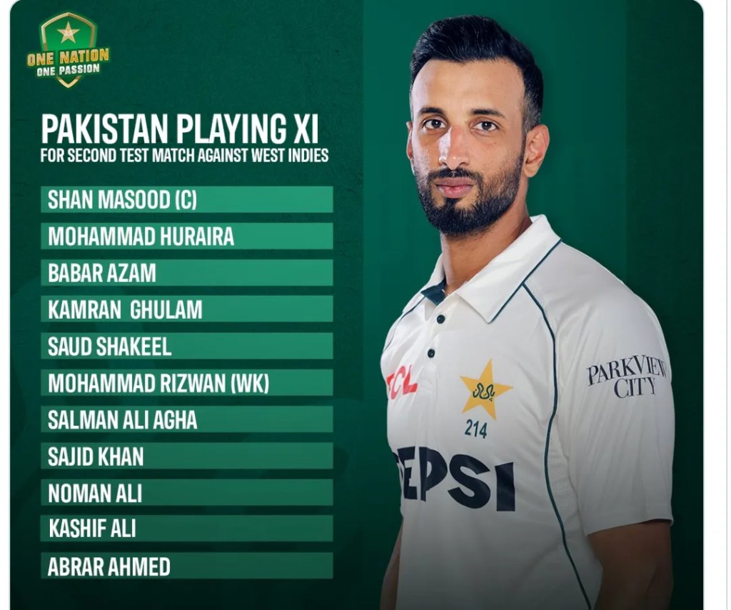Pakistan has announced their playing XI for the second Test against West Indies, with a notable change in the bowling attack. Khurram Shahzad makes way for debutant Kashif Ali, who will make his first appearance in the series at Multan Cricket Stadium.