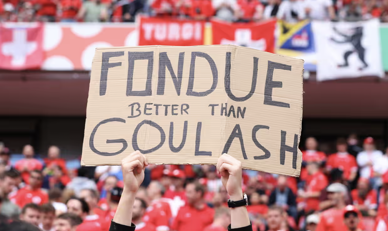 “Fondue better than goulash,” read one at the Switzerland vs. Hungary match. “Eat Pasta, Run Fasta,” proclaimed an Italian poster at the Albania game. Polish fans displayed, “Kielbasa [sausage] better than gouda,” against the Netherlands.