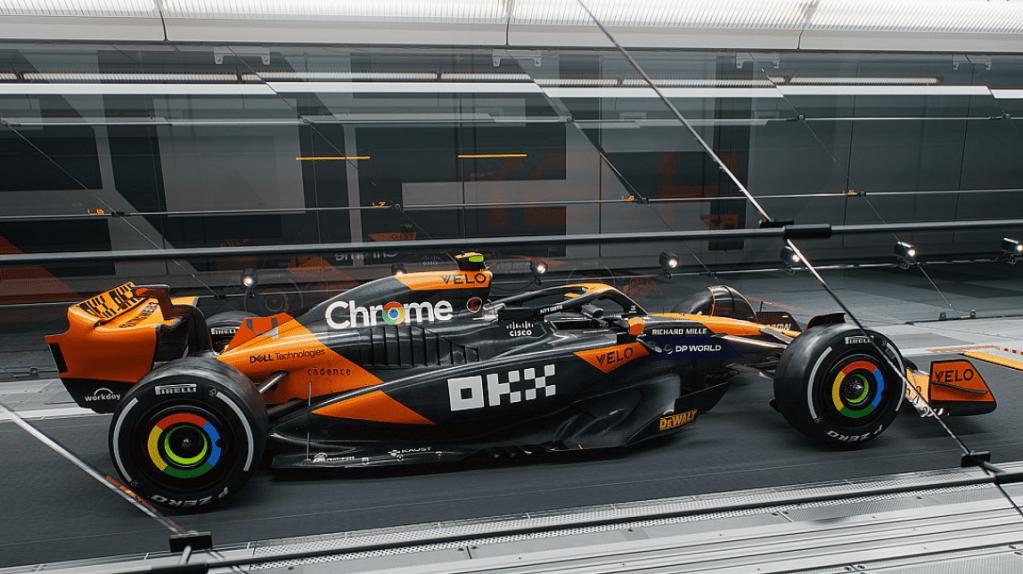 The livery features chrome touches, including sponsor OKX’s logo and driver numbers. Chrome colors were a prominent part of McLaren’s scheme from 2006 to 2014, making a return at 2023 British-Grand-Prix with-Google.